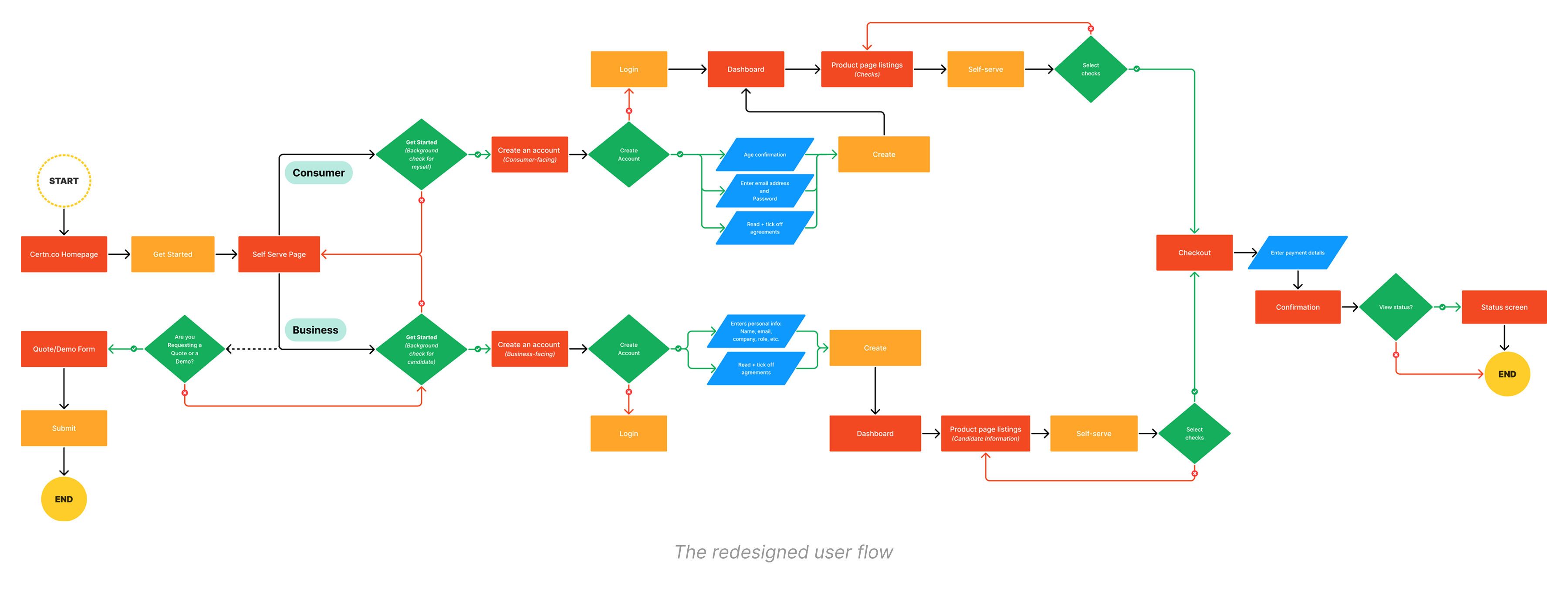 User flows were used to define the step-by-step experience for critical user actions, including demo requests and account creation. Separate flows were mapped for B2B and B2C users to reflect their unique needs while maintaining a consistent, intuitive structure from start to finish. These flows helped validate feature requirements and simplify complex interactions.